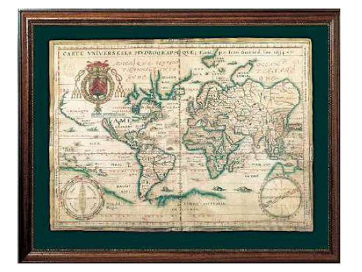 La nuova base nautica fu scelta da Jean Guerard perché molto comoda per rappresentare le grandi latitudini boreali, dove ancora erano in atto costanti spedizioni esplorative e nuove scoperte geografiche fondamentali per la politica economica e di espansione delle maggiori Potenze dell’epoca. Infatti, la Carta Universale è soprattutto una straordinaria rappresentazione politica del mondo, aperta alle nuove concezioni e alle nuove correnti, ma nonostante la modernità grafica ed artistica è ancora legata alla cosiddetta “Geografia degli Antichi”, con una miriade di iscrizioni proprie di una visione del mondo fra il reale ed il leggendario. Di eccezionale fattura, riporta in grandi dimensioni lo stemma del Cardinale Richelieu, sotto i cui auspici operava l’Istituto Idrografico della Marina, protagonista fondamentale e nevralgico per lo sviluppo della Francia sui mari.