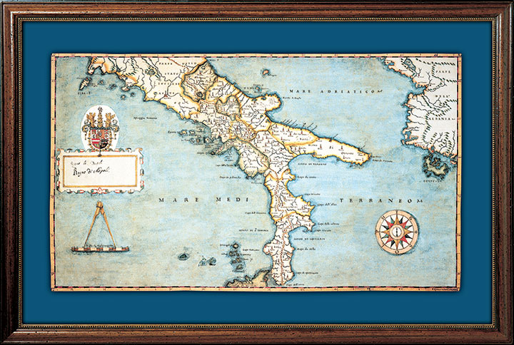 Questa accurata raffigurazione del Regno di Napoli, conservata in forma di Atlante presso la Sezione Manoscritti Antichi della Biblioteca Nazionale di Napoli, rappresenta certamente la più bella e interessante Carta del Regno dall’inizio del XVII secolo giunta fino a noi.